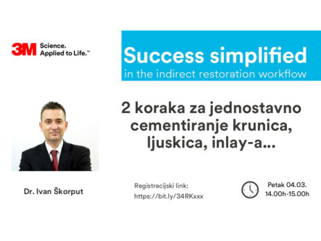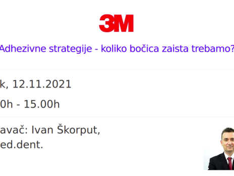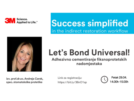 Zadnji webinar u organizaciji 3M-a prije ljetne stanke je posvećen adheziji i adhezivnoj problematici. Najčešći problem kod kompozitnih restauracija, neovisno je li riječ o vitalnim ili avitalnim zubima, je pojava mikropropuštanja između rubova ispuna i zuba što uzrokuje nastanak rubnog karijesa, obojenja, preosjetljivosti i pucanja ispuna.U predavanju će biti objašnjeni najnoviji adhezijski sustavi i objasnit će se njihove prednosti, ograničenja, klinički rad, mogućnosti primjene u restaurativnoj dentalnoj medicini i postendodontskoj opskrbi zuba.Naslov webinara je »Sve što ste htjeli znati o adheziji.«.Predavanje...
