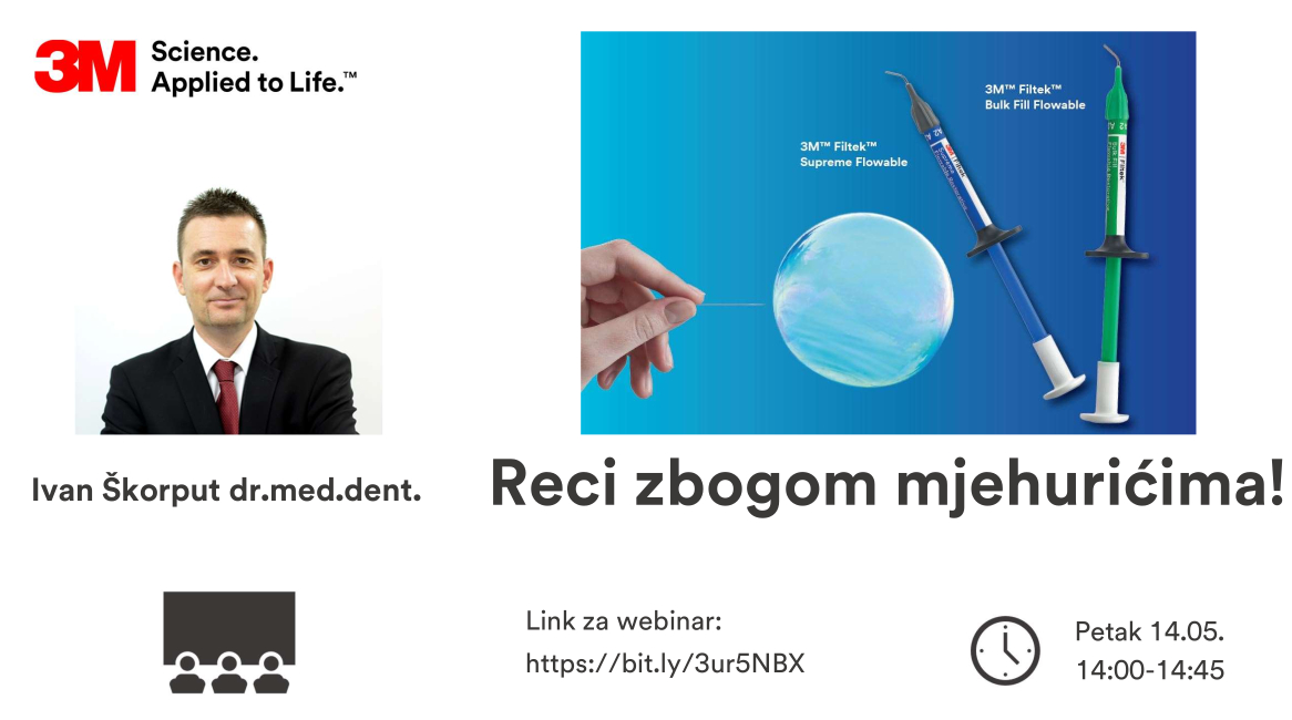 3M vas poziva da, kao i do sada, sudjelujete na edukaciji pod nazivom “Reci zbogom mjehurićima u tekućim kompozitima”. Tema webinara su novi tekući kompoziti, Filtek™ Supreme Flowable i Filtek™ Bulk Fill Flowable.